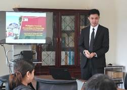 Rei Chino Pua先生は、自身の大学での教育のおける理念及び実践の状況について、Juan Paulino先生は日本とフィリピンの会計学の比較に焦点を当てて発表を行い、その後参加者による質疑応答及びデイスカッションを行った。