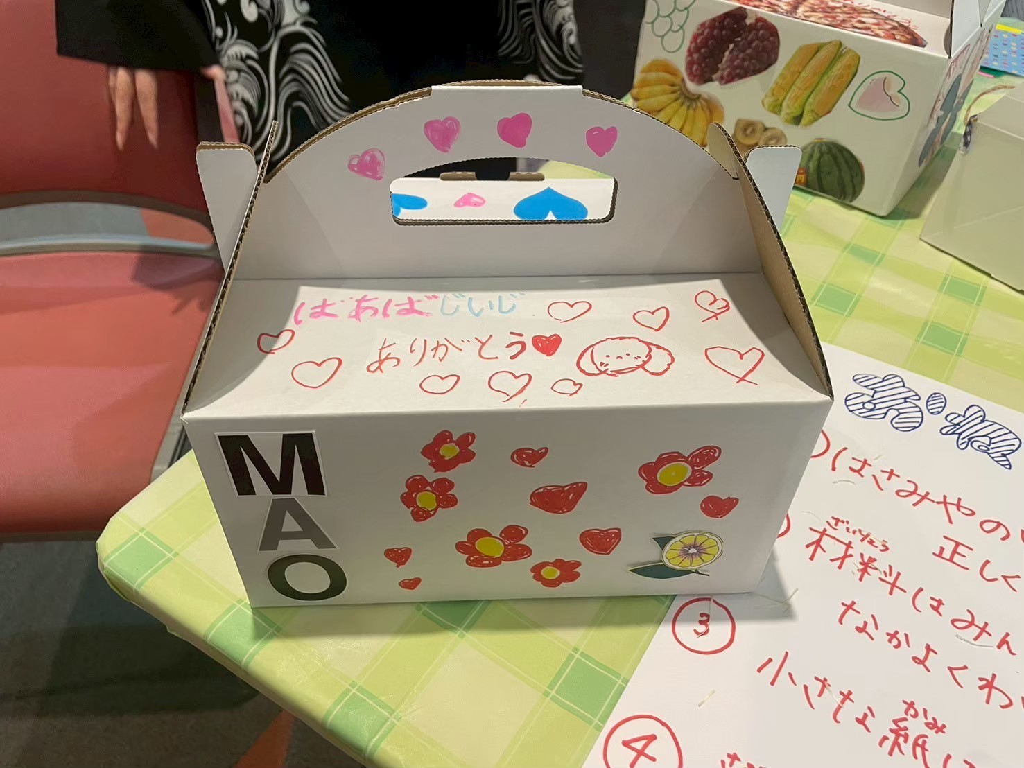 参加者がコラージュしたボックスにシャインマスカットを梱包して渡す様子 |