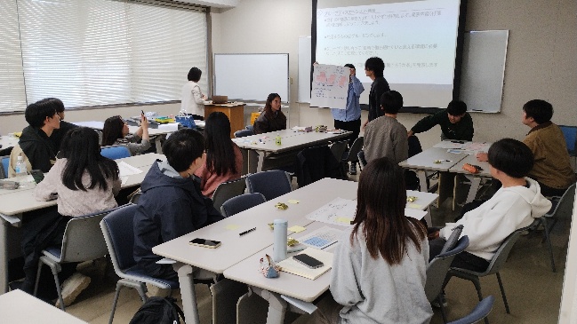 次に、それを基に、学生たちが「自分らしく働くこと」(特に地方で働くこと) についてグループディスカッションを行い、その結果を複数のキーワードとしてまとめ、各グループ代表者から発表してもらいました。参加した学生は、自分にはない発想や視点を知る機会になりました。